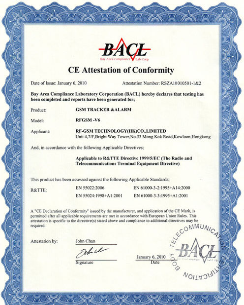 Padrão:CE Número:RSZA10010501 Data de Emissão:2012-1-6 Âmbito Gama /:R&TTE Emitido por:BACL |