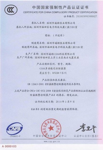 Padrão:3C Número:2010030903000027 Data de Emissão:2010-03-09 Âmbito Gama /:RFGSM-V Emitido por:CSP CHINA |